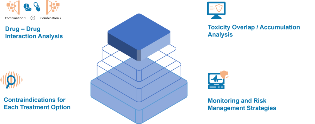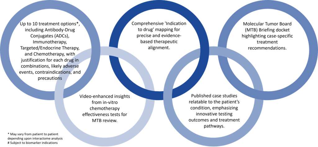 Up to 10 treatment options*, including Antibody-Drug Conjugates (ADCs), Immunotherapy, Targeted/Endocrine Therapy, and Chemotherapy, with justification for each drug in combinations, likely adverse events, contraindications, and precautions.
